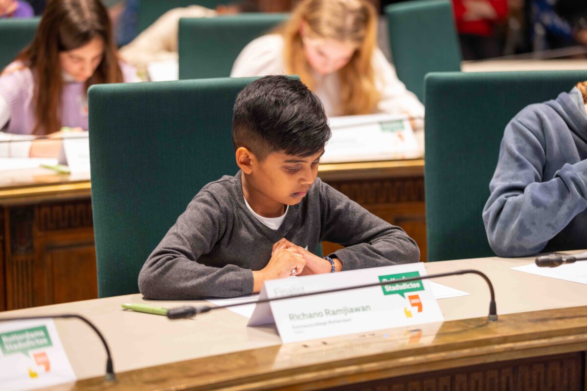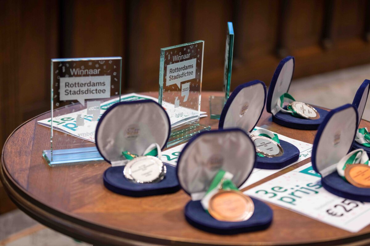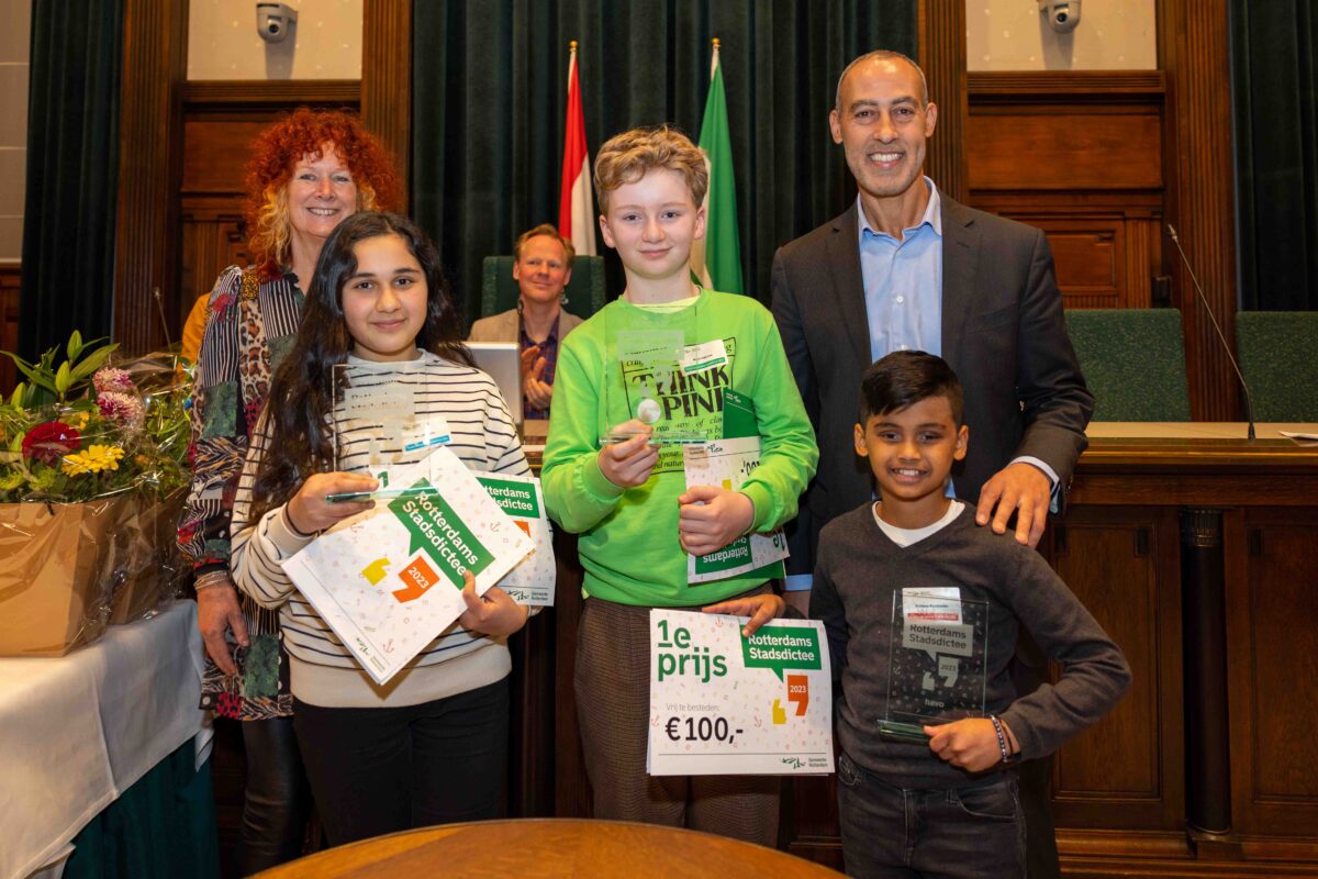 Deze week deden vier brugklassers namens het Emmauscollege mee met het Stadsdictee Rotterdam. In de raadzaal van het stadhuis namen Laura van Gelderen, Xinrui Zhou, Joëlle van Surksum en Richano Ramjiawan het op tegen leerlingen van zestien Rotterdamse scholen. Schrijfster Carrie had er een pittig dictee van gemaakt, maar daardoor lieten onze leerlingen zich niet uit het veld slaan; Richano heeft de eerste prijs gewonnen en Joëlle wist de derde prijs te bemachtigen. Van harte gefeliciteerd met dit mooie resultaat en allen bedankt voor het vertegenwoordigen van onze school, jullie hebben het alle vier heel goed gedaan!